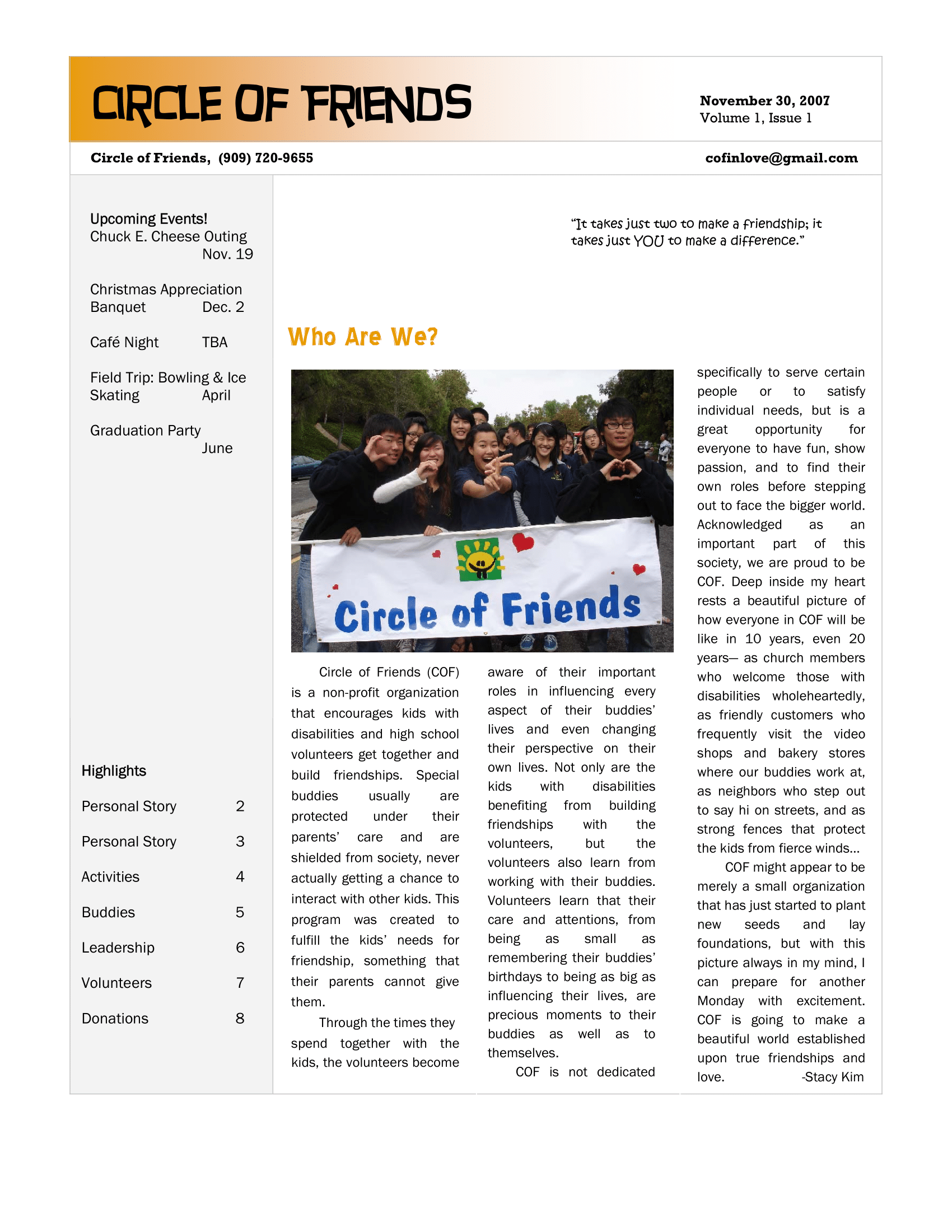 Circle of Friends (COF) is a non-profit organization that encourages kids with disabilities and high school volunteers get together and build friendships.